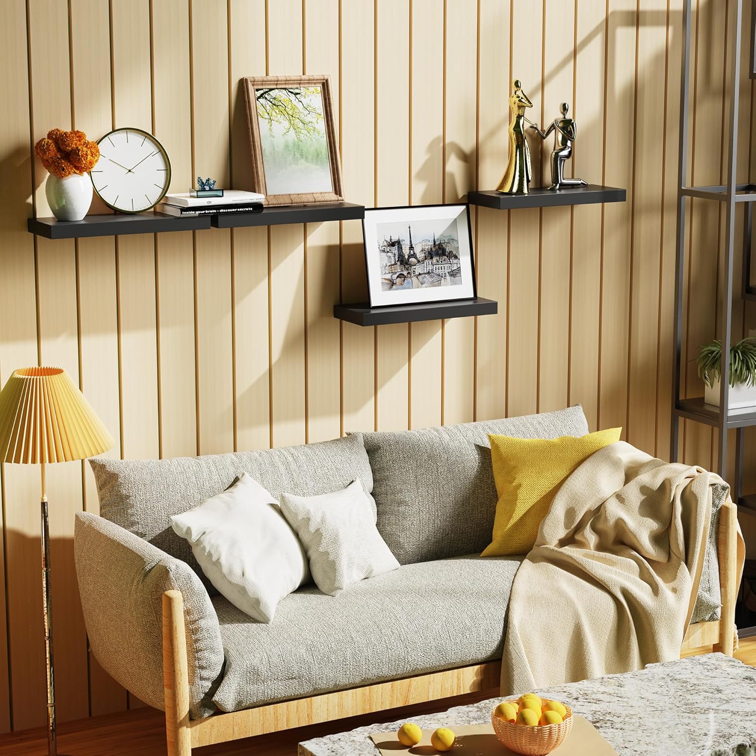 - ăVersatile & FunctionalăOur black floating shelves for wall can simplify our life which let everything will be in reach. Our wall shelf is a perfect space to display our family pictures, books, memorandums, charming antiques or artwork, spices or jars and fresh green plant. Our floating shelf wood not only give us extra storage but also improve the beauty of our home decor. Our black shelves can be perfectly integrated and decorated in the bathroom, kitchen, living room, bedroom and other place.