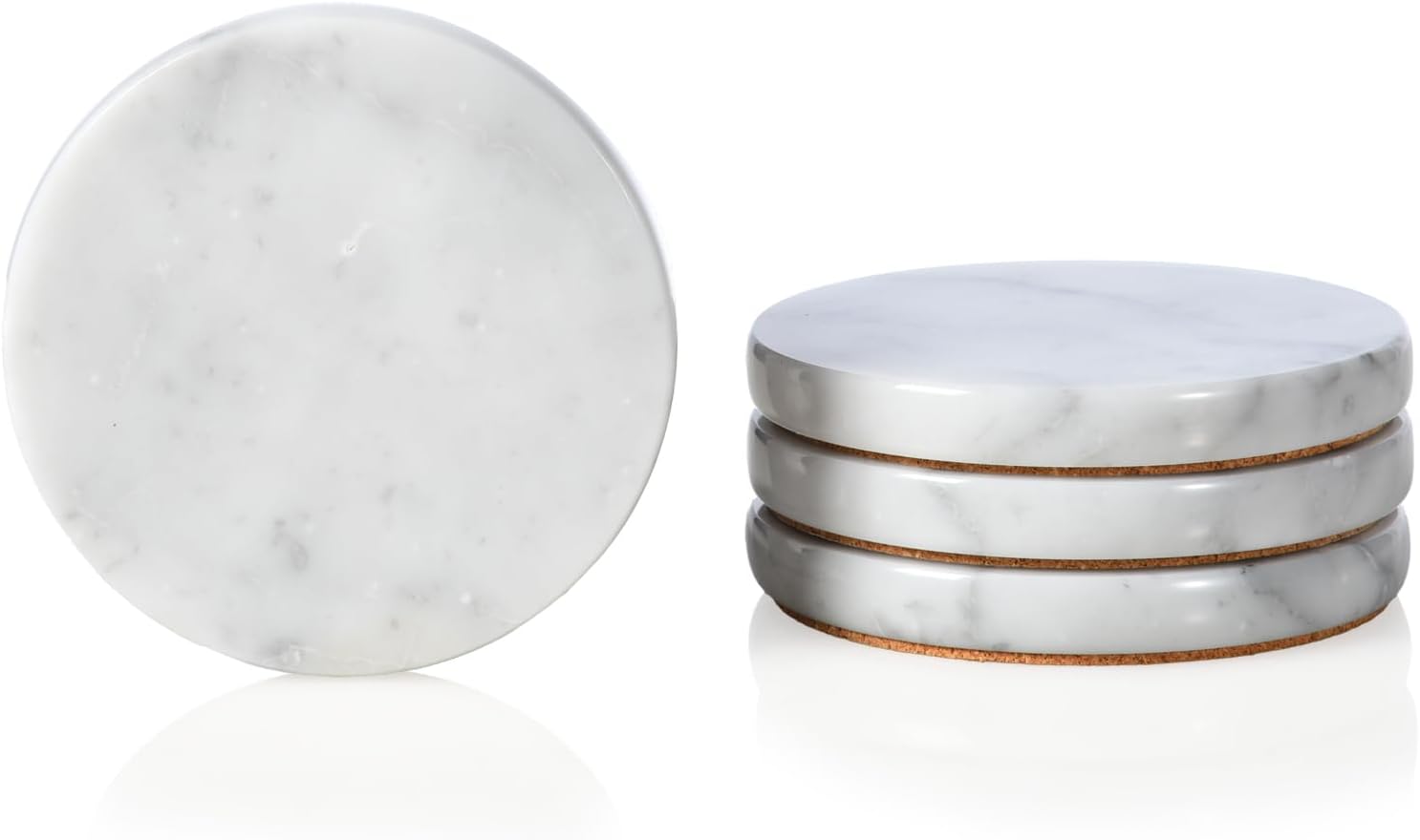 - Simple and Practical: Including 4 pieces of natural carrara white stoneware coasters ( size: Φ 4'' x H 0.4'' ), the drink accessory set is a good size for all kinds of glasses, teacups and mugs, which can hold hot and cold drinks without worry. Classic round design, practical and stylish, perfect for kitchen, living room, bar, hotel, restaurant, party and so on