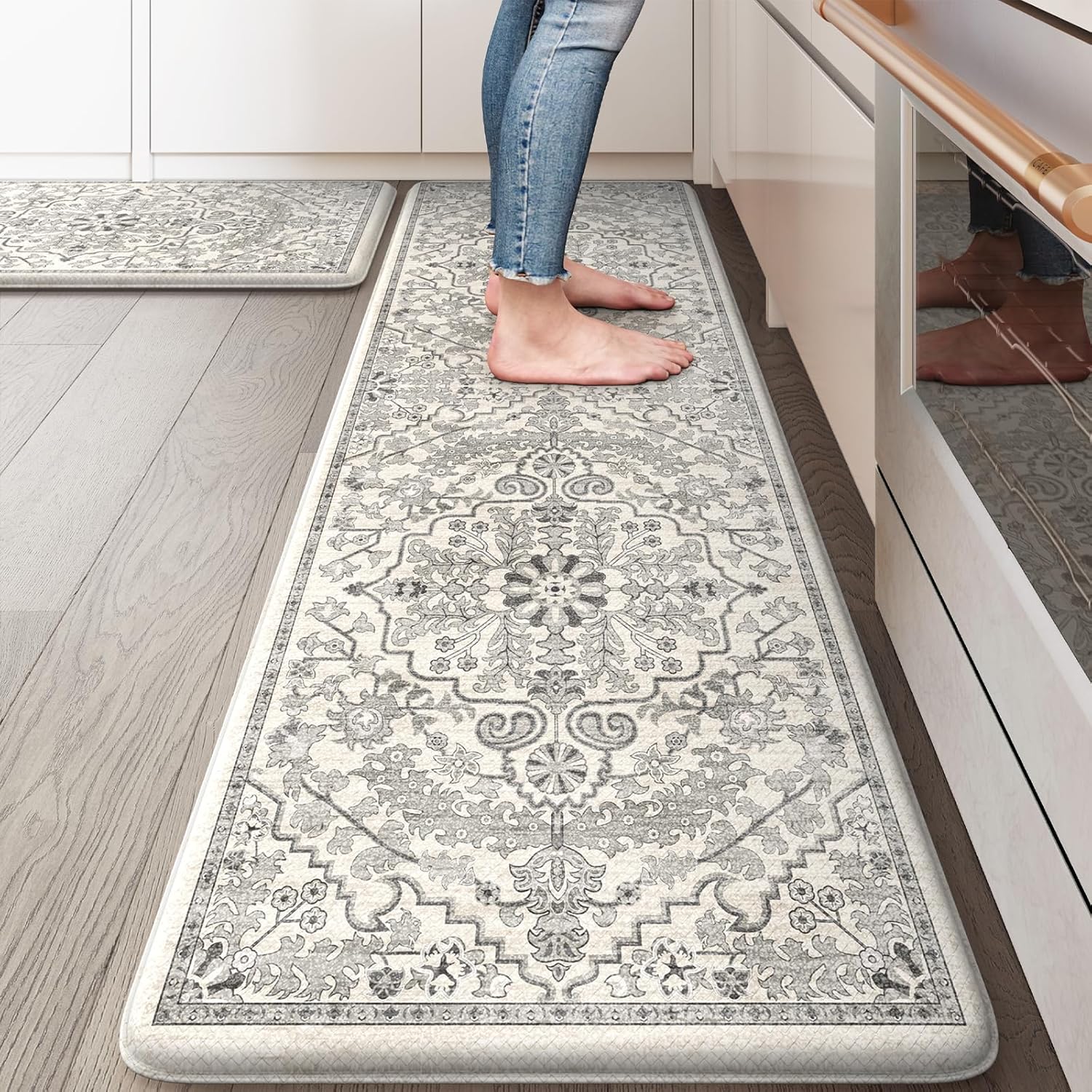 KIMODE Anti Fatigue Kitchen Mats, 2 PCS Cushioned Kitchen Rugs and Mats, Boho Kitchen Floor Mats Non Slip, Comfort Foam Standing Mat for Laundry, Office, Sink, Grey 17.3" x 59"+17.3" x 29"