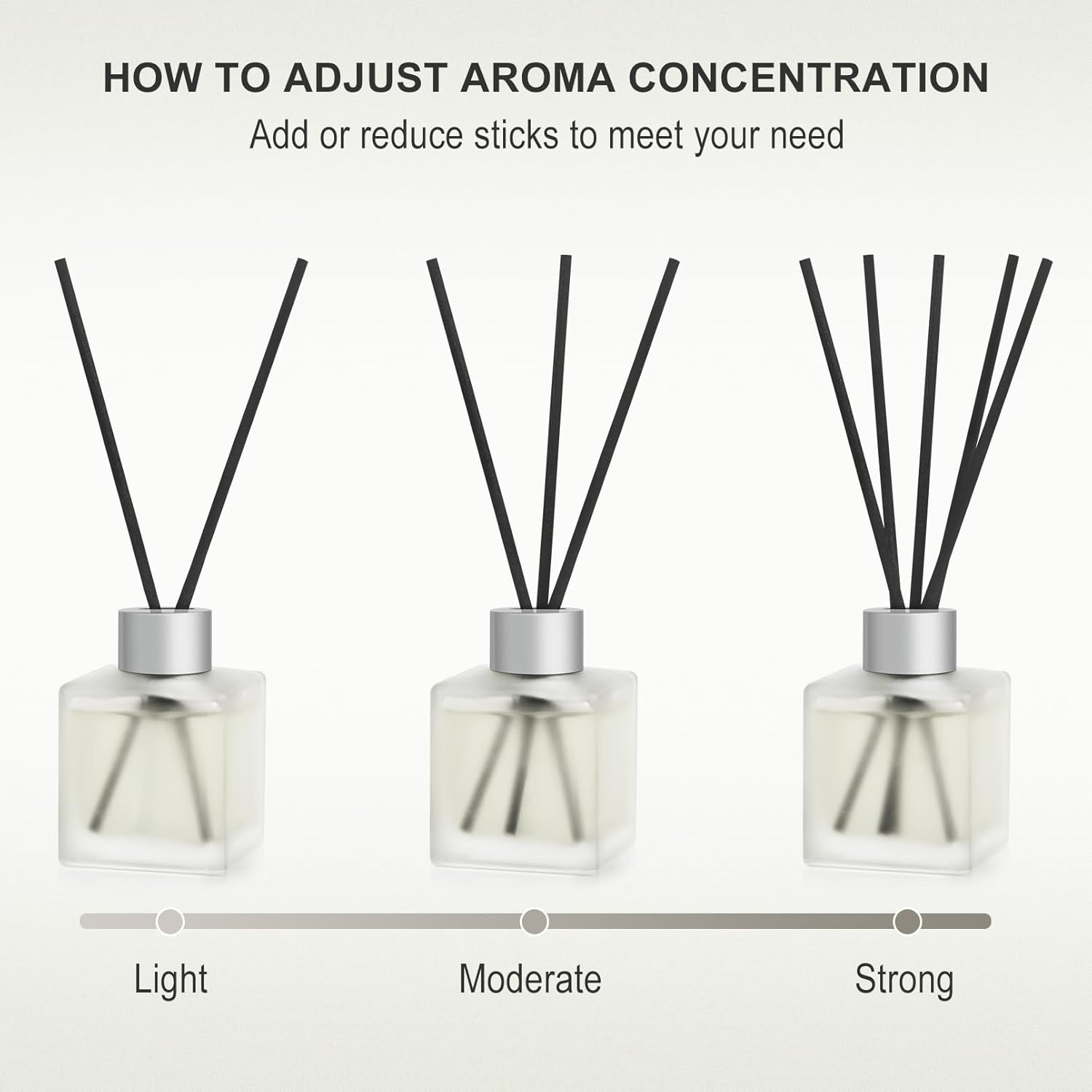 - [ Adjustable Aroma Concentration ] - Adding or subtracting sticks appropriately can adjust the diffusion concentration. The first use of sticks can be reversed several times to quickly volatile the aroma. The effect of aromatherapy can be affected if placed for a long time. At this time, the sticks can be flipped to restore volatilization.