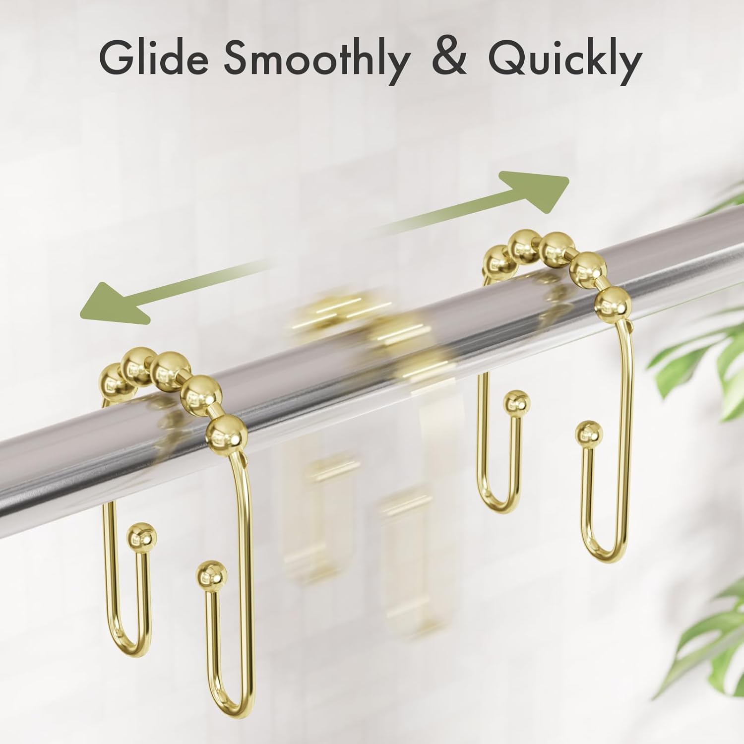 - Unique design: These shower curtain hooks gold feature a unique double-hook design, allowing you to hang both the curtain and liner simultaneously. The inward-bending shower hooks provide extra security, preventing the curtain from sliding off