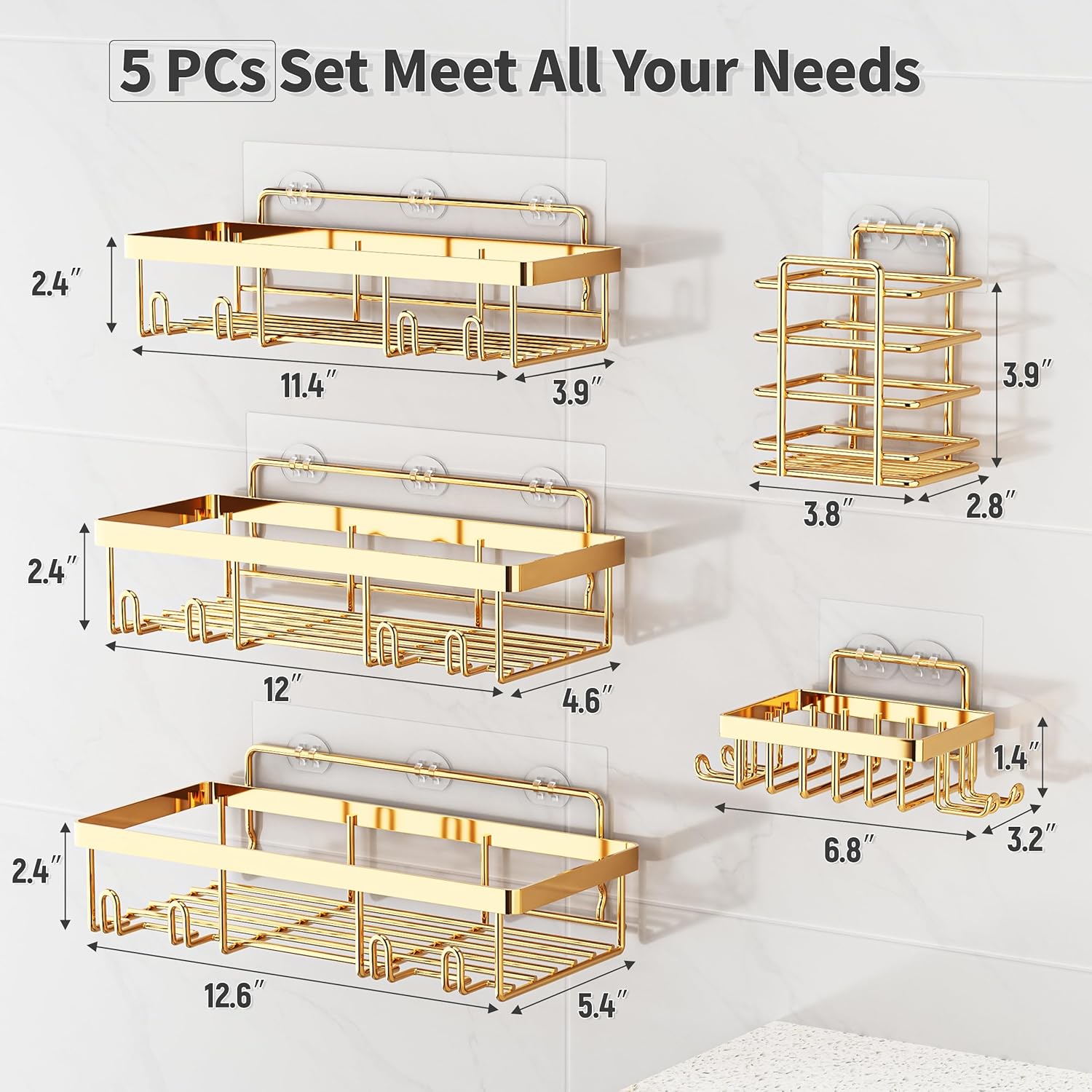 - 5 PCs Large Storage Shower Caddy: The bathroom shower organizer set comes with 3 Gold wall shower caddies, 1 soap holders, 1 toothbrush holder and 5 adhesives. The shower storage shelves can store all of your bath supplies