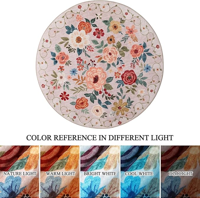 DUKINO Floral Round Rug, 4ft Washable Round Area Rug, Non Slip Indoor Low Pile Circle Rug, Soft Small Boho Design Circle Rug for Bedroom, Entryway, Living Room, Dining Room,Beige