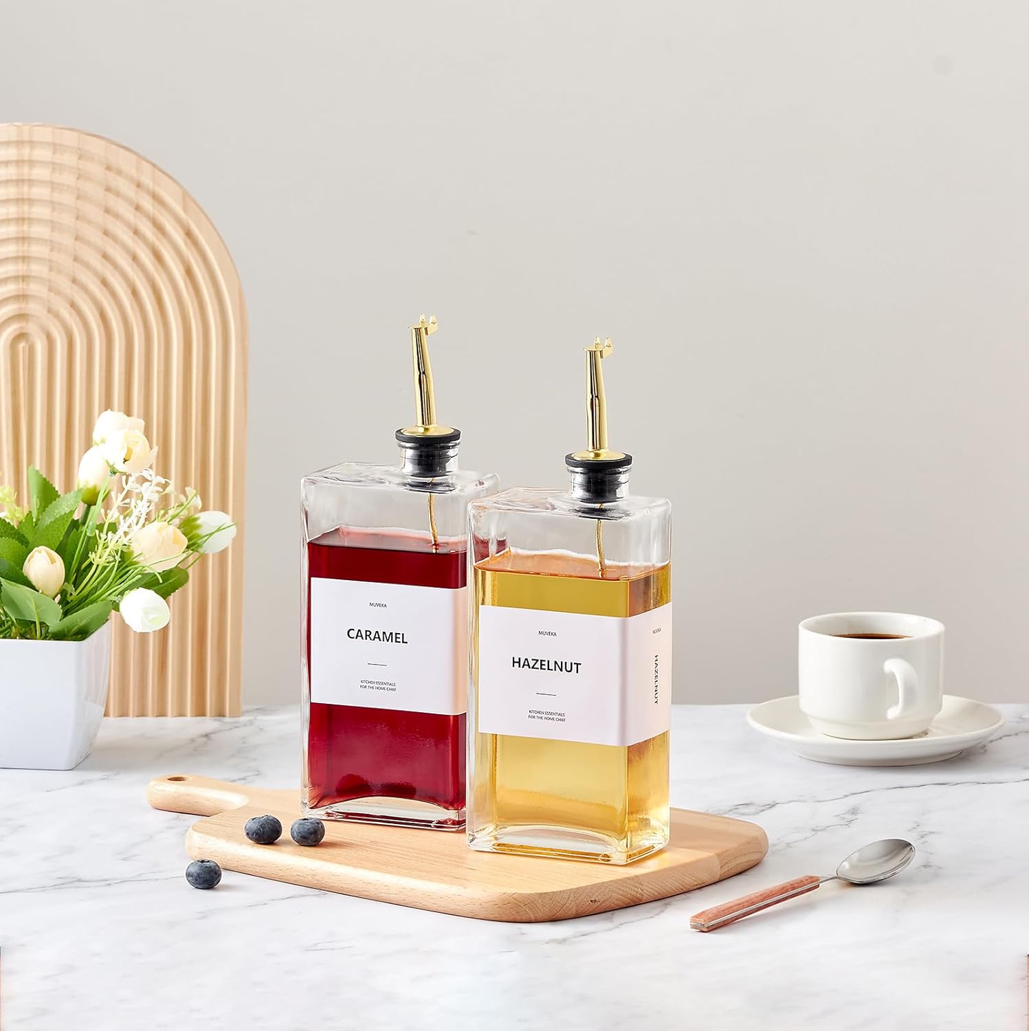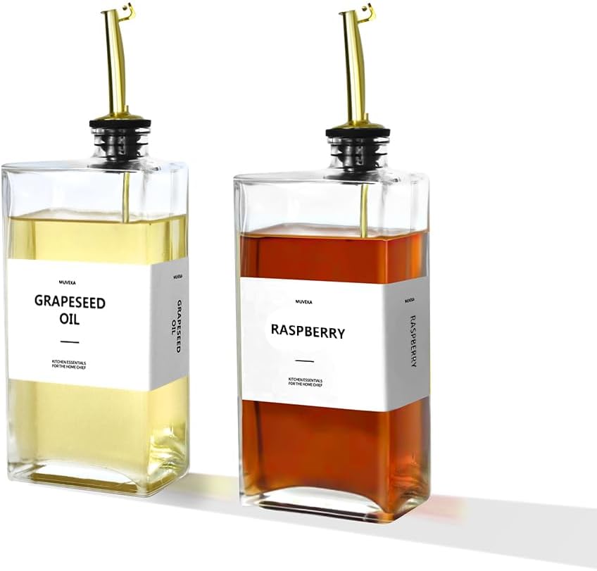 - 【Thoughtful Design & Effortless Convenience】: Every oil and vinegar dispenser bottle set comes with 2 olive oil dispenser bottles, 2 weighted self-closing spouts, 2 replacement spouts, 1 collapsible funnels, 1 cleaning brush and 40 labels. The oil dispensers for the kitchen are also practical for holding or dispensing oil, vinegar, soy sauce, cooking wine, or mouthwash. This 2 pack oil dispensing set meets most of your daily needs and is prefect to share with your friends and families.