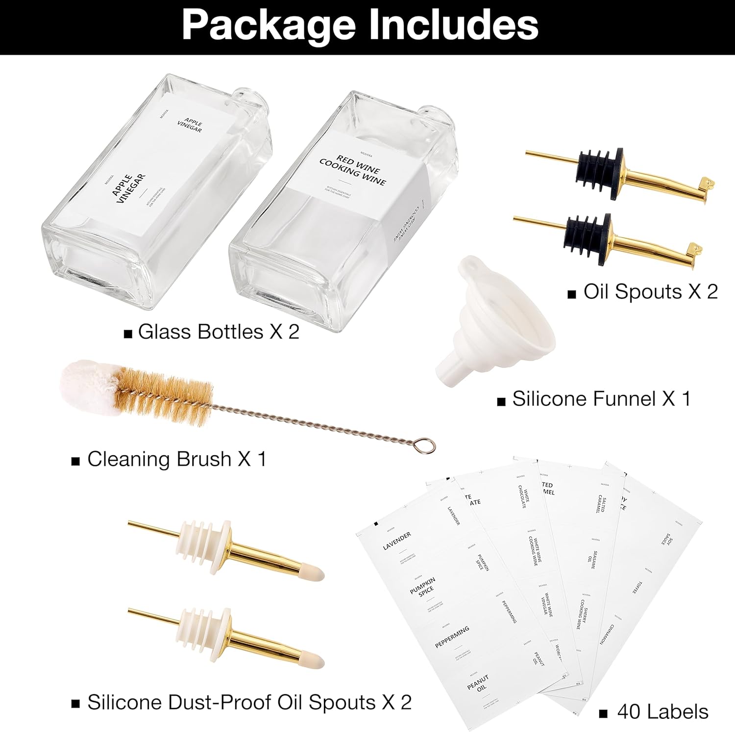 - 【A Good Helper to Organize Your Kitchen】: The 36 printed labels and 4 blank ones are oil-proof, non-rolling, and tear-resistant, making it easy to differentiate your seasonings, helping you find the right one while you are busy cooking. Also, the food-grade funnels solve the filling and refilling issue, making everything clean and neat, and the brush allows you to clean the oil decanter thoroughly. Last, the olive oil container set is also ideal for BBQs, picnics, camping, etc.