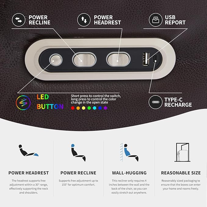 - WELL-DESIGNED CONTROL CENTER : Unlike other moive theater chairs, we designed the control center on the outside of the armrests so that you do not block your movement when you connect the usb charging. Through it, you can always adjust your headrest, recliner, light switch and color change. usb port and Type-c port can meet the majority of conventional devices charging. Maximize functionality and convenience