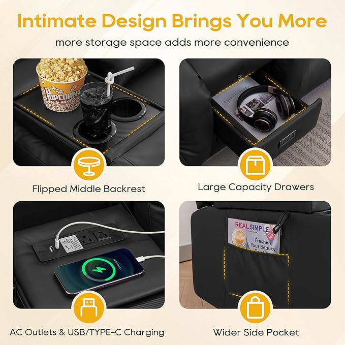 - UNIQUE AND MULTIFUNCTIONAL DESIGN: The design of this modern electric recliner loveseat takes into account versatility. Equipped with two intelligent control panels, it can easily adjust the tilt angle and LED lights. It is also equipped with 4 convenient USB ports and a power outlets. 4 cup holders and storage space. Compared to the unique feature, our sofa has built-in Bluetooth speakers to create an immersive stereo experience