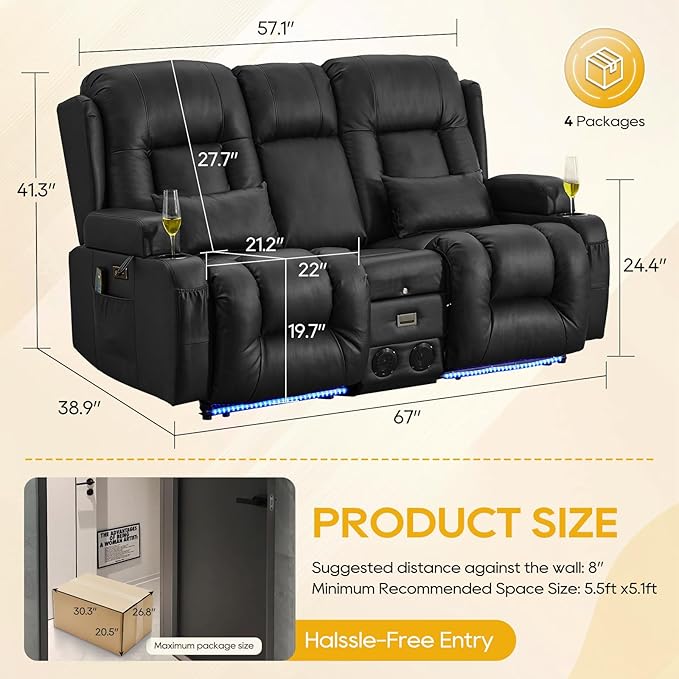 - RECLINER WITH AMBIENT LIGHTING: Experience the perfect blend of comfort and ambiance with our 2-seater rv recliner featuring strategically placed 4 colors LED lights, creating a captivating atmosphere. You can customize the lighting colors to match your mood or the content you are enjoying. Whether you desire a vibrant and energetic atmosphere or a softer and more intimate environment, the ambient lighting enhances the overall aesthetic appeal of your home theater