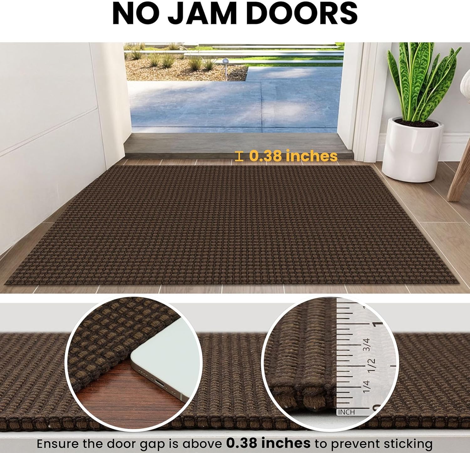 - Jam Doors Care: Size: 2.6' x 12' (31.2"x144") | Thickness: Rug: 0.16 in. Edge: 0.38 in | Color: Brown. Notes: We made the reinforced edges (0.38 in.) for extra durability, please measure door clearance is over 0.4" to ensure the rug doesn't get stuck