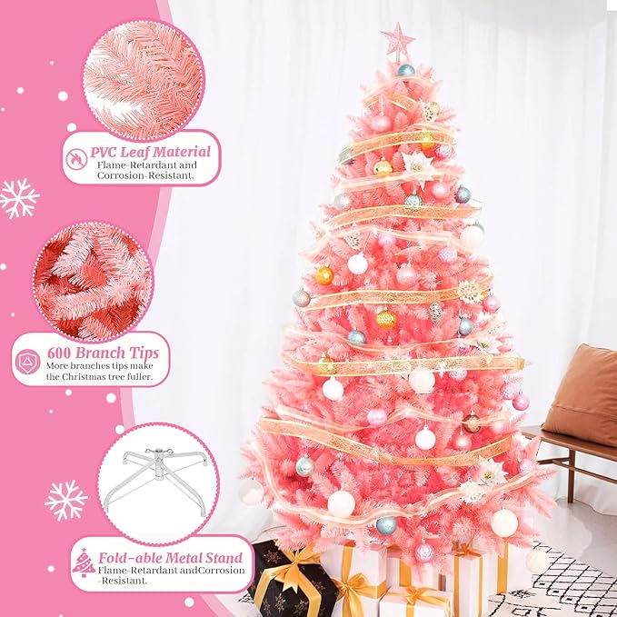 - 【More Branch Tips】5ft pink fake Christmas tree has 600 branch tips, Made of brand new material with bright and glossy colours, thicker and wider leaves, more branch tips make the slim Christmas tree look more fluffy and more realistic in appearance.Fully open these branches and you will have a perfect Christmas tree to the fullest enjoy your Christmas holiday.