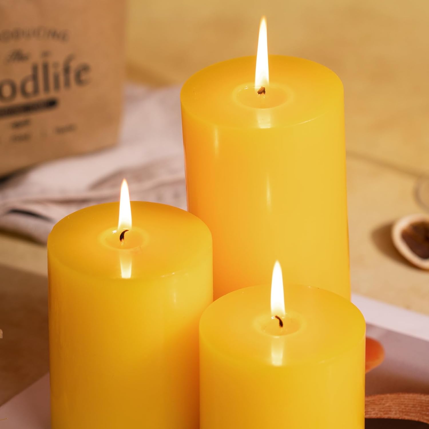 KONNI Yellow Pillar Candles Set of 3, 3"x 6" Unscented Pillar Candles Bulk, 56 Hours Long Burning Candles, Smokeless&Dripless Large Round Candle for Wedding, Home Decoration, Parties, Spas, Dinner
