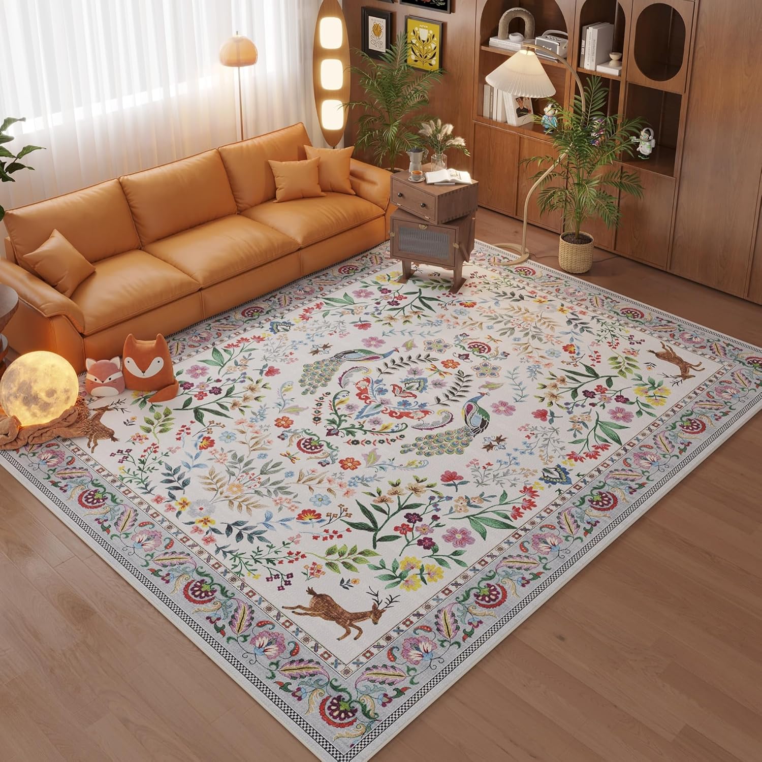 Living Room Rug 5x7 Rug Machine Washable Area Rug Floral Non-Slip Low Pile Large Rugs for Living Room, Bedroom, Farmhouse, Dining Room, Kids Playroom(Colorful)