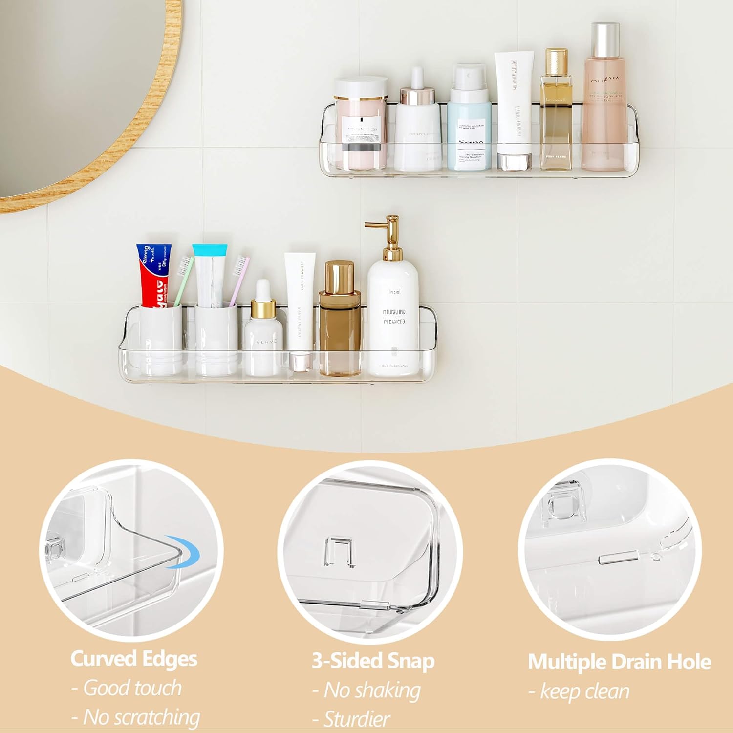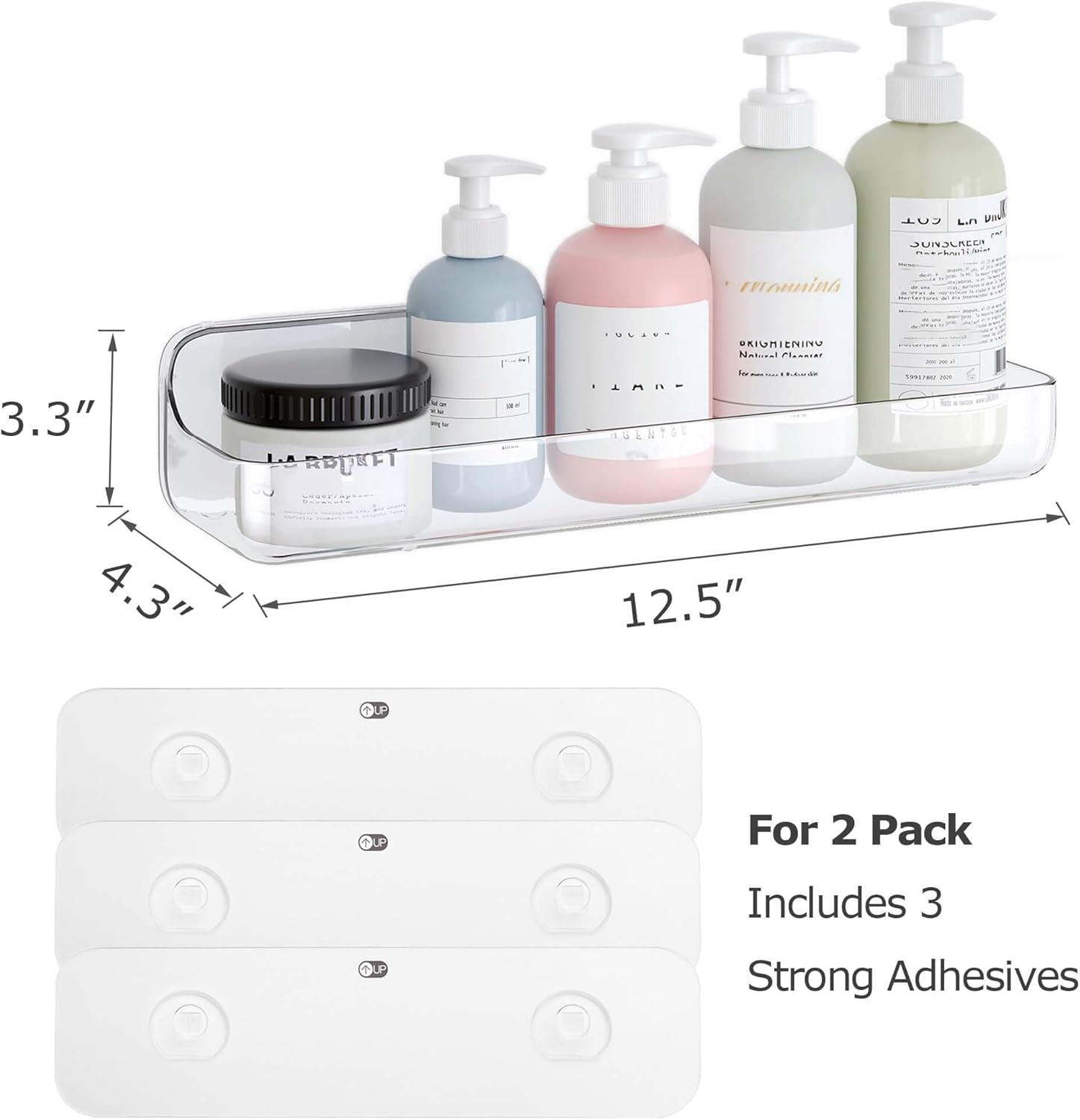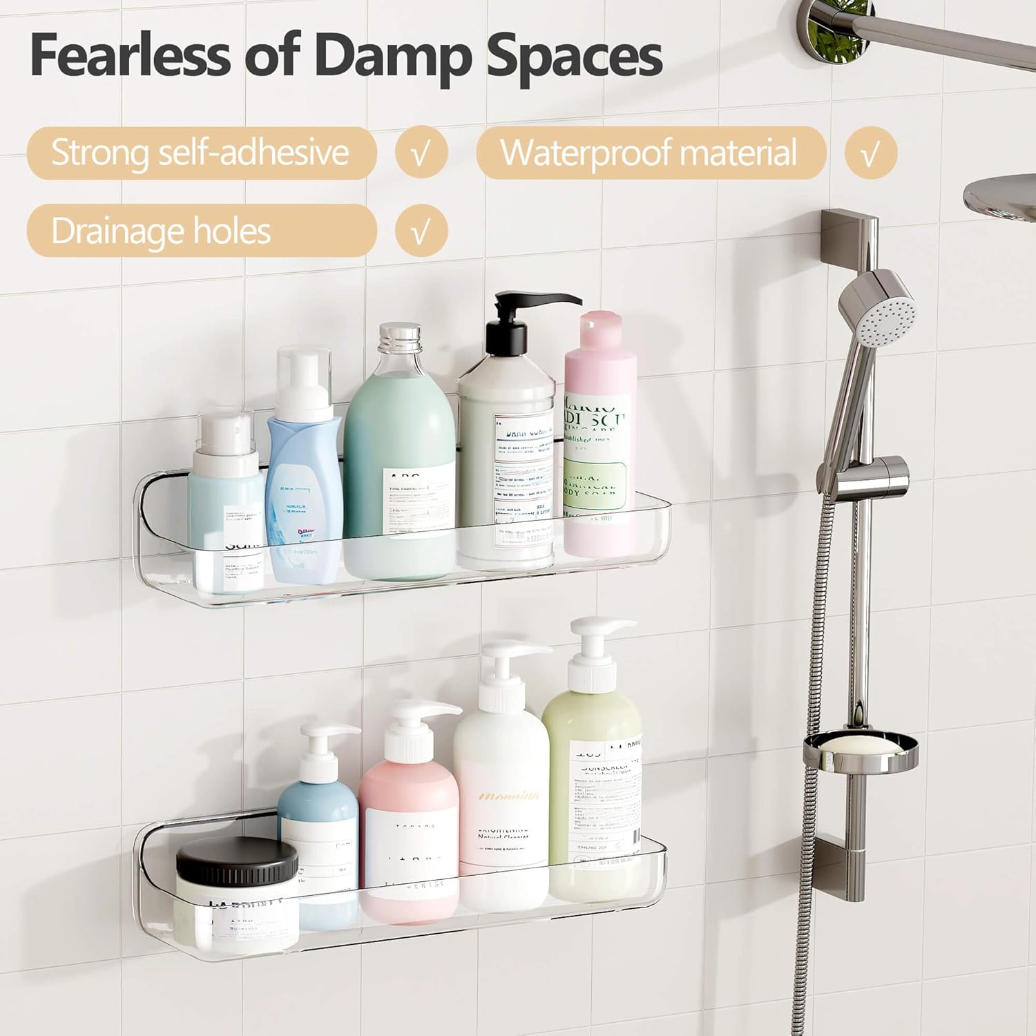 UDD Acrylic Shower Caddy Adhesive Shelf, 2pc Plastic Shower Organizer with Self Adhesive Tape, No Drilling Clear Wall Mount Shower Shelves for Bathroom Kitchen, Clear
