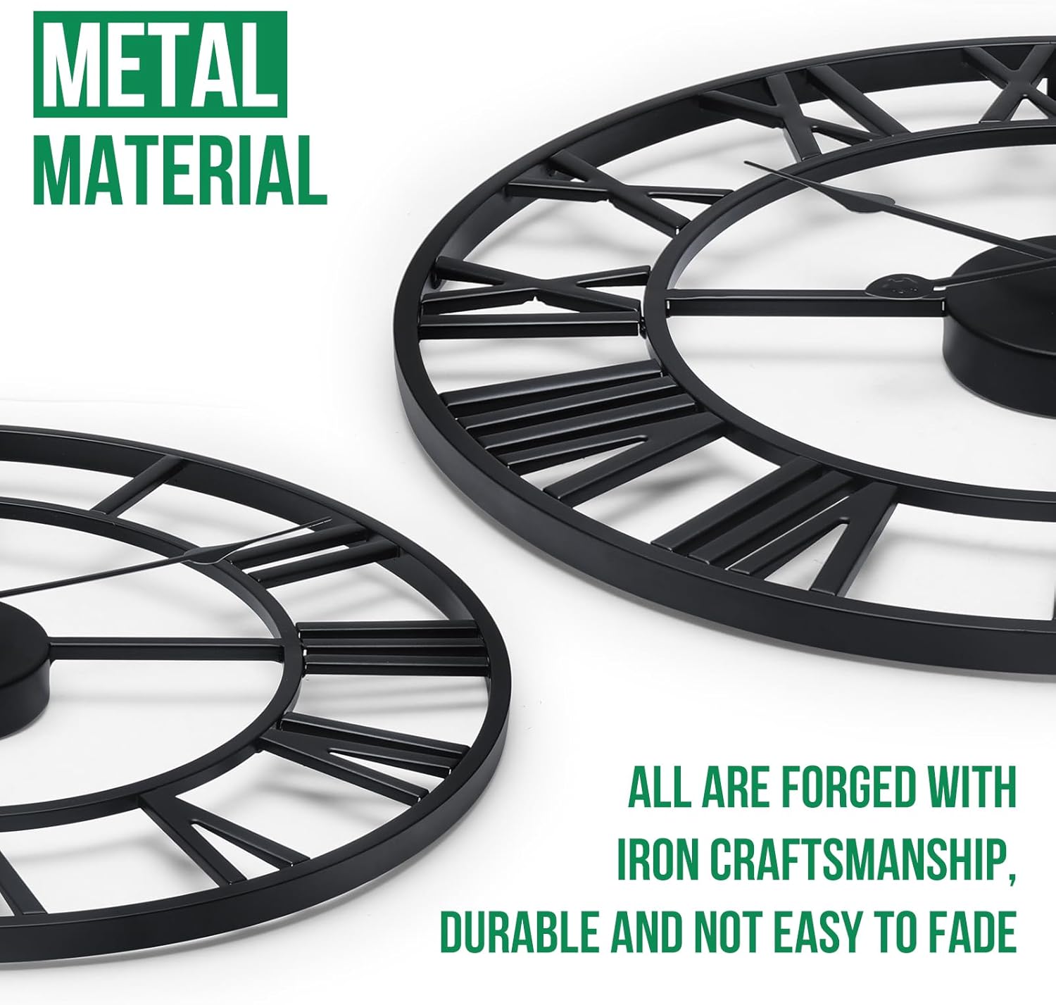 Large Wall Clock 16 Inch Black Roman Numerals Metal Clock Battery Operated Silent Non-Ticking Decor Clock Modern Round Oversize Wall Clocks for Home, Hotel, Office, Bedroom (Black, 16inch)