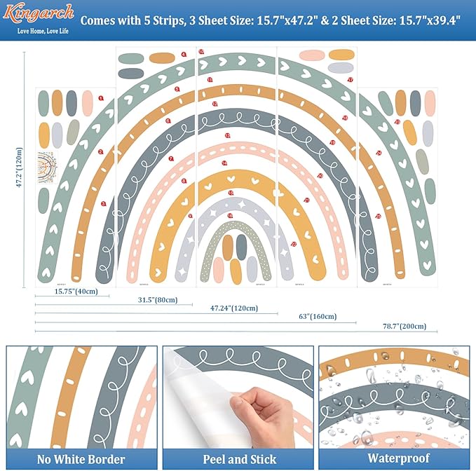 - [Upgraded Version Kids Stickers]: Our nursery decor has no white or transparent border around the different color strips,which can match any color of walls. The others' have white between the rainbow colors, only fit for white surface.