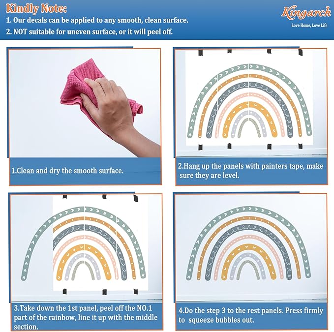 - [Easy To Apply Wall Mural]: Easily unpeel and re-peel if you mess up the alignment. 1. Clean and dry the smooth surface. 2. Hang up the panels with painters tape, make sure they are level. 3. Take down the 1st panel, peel off the NO.1 part of the rainbow, line it up with the 2nd section. 4. Do the step 3 to the rest panels. Press firmly to squeeze bubbles out.