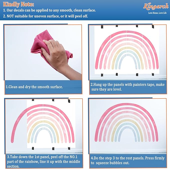 - [Easy To Apply Wall Mural]: Easily unpeel and re-peel if you mess up the alignment. 1. Clean and dry the smooth surface. 2. Hang up the panels with painters tape, make sure they are level. 3. Take down the 1st panel, peel off the NO.1 part of the rainbow, line it up with the 2nd section. 4. Do the step 3 to the rest panels. Press firmly to squeeze bubbles out.