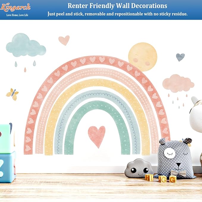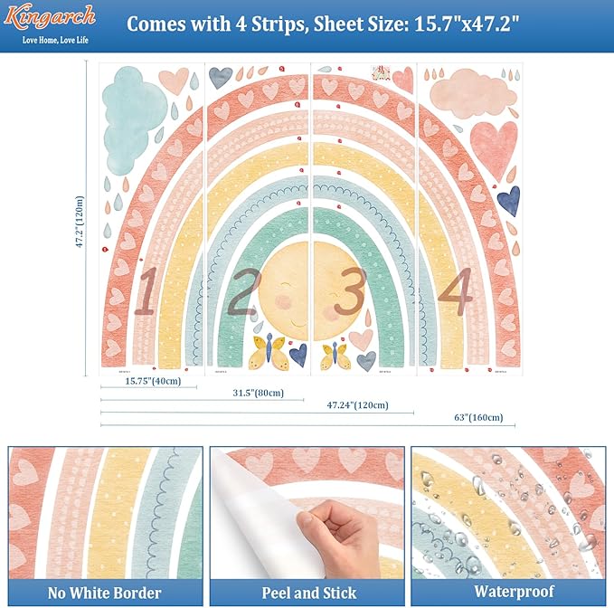 - [Upgraded Version Kids Stickers]: Our nursery decor has no white or transparent border around the different color strips,which can match any color of walls. The others' have white between the rainbow colors, only fit for white surface.