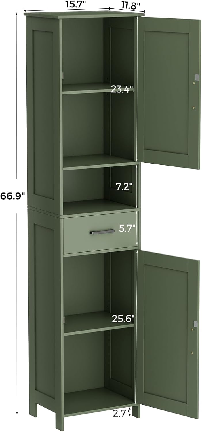 Homhedy 67" H Tall Bathroom Storage Cabinet with 2 Barn Doors and 1 Drawer, Narrow Storage Unit, Adjustable Shelves, Floor Cabinet for Bathroom, Living Room, Entryway, Kitchen, Green, (15.7" W)