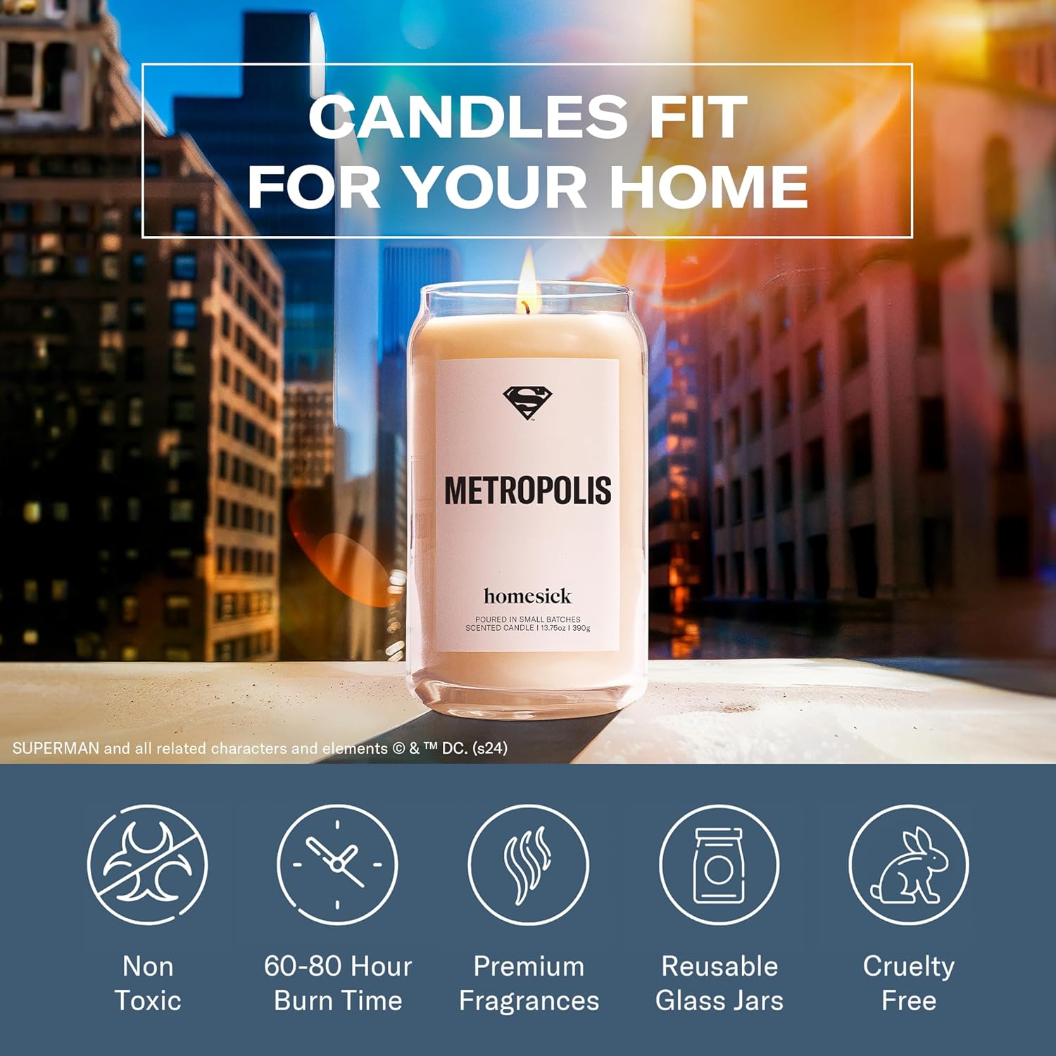 - Truth and Justice: The sun’s golden glow highlights sky high buildings as notes of concrete rise from below. A familiar shadow flies overhead. Spoiler alert, it’s not a bird nor a plane. The Metropolis candle from Homesick promises to lift you up with sunlit, golden optimism. 13.75 oz.