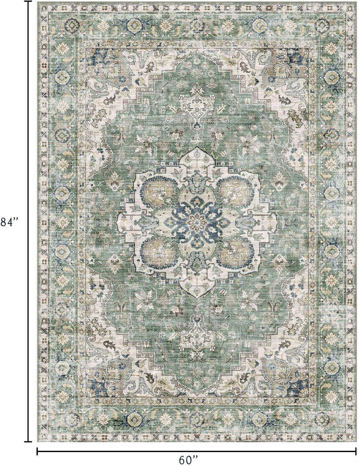 Washable Area Rug 5x7 - Boho Living Room Rug Stain Resistant Soft Bedroom Rug Ultra-Thin Sage Green Vintage Oriental Farmhouse Dining Room Rugs for Under Table Indoor Carpet for Living Room