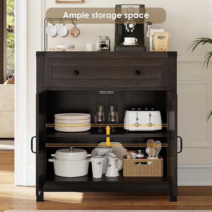 - Ample Storage Space: The kitchen storage cabinet features a large drawer and 2 doors cabinet with an adjustable shelf to meet your storage needs for coffee beans, seasoned, and some sundries, while the wide tabletop creates an accessible way to display microwave, toaster, and coffee makers