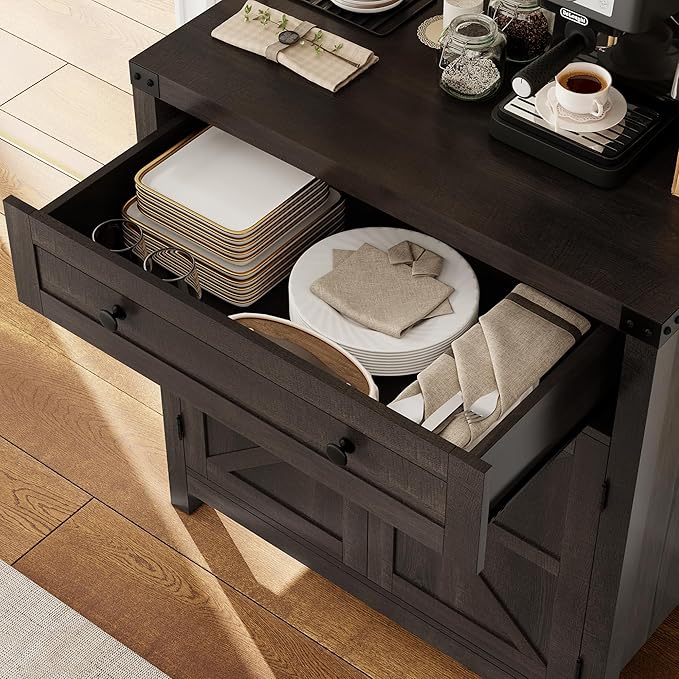 HOSTACK Coffee Bar Cabinet, Kitchen Storage Cabinet, Modern Farmhouse Buffet Sideboard with Drawer and Adjustable Shelf, Barn Door Accent Cabinets for Kitchen, Dining Room, Entryway, Dark Brown