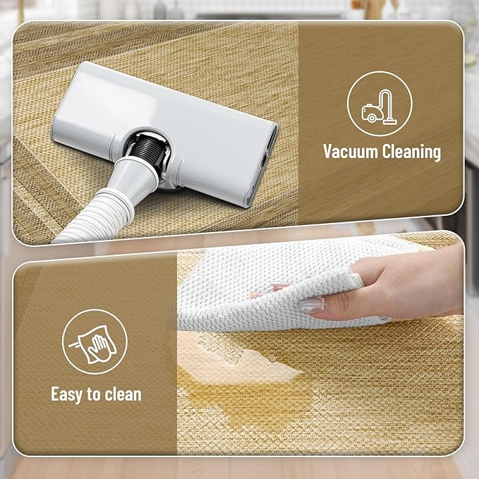 - Waterproof & Easy to Clean:The anti-fatigue mats are constructed with heavy-duty PVC outer lining, which is waterproof, oilproof, and stain-resistant. Just wipe the mats down with a damp cloth or use a hand-held vacuum to clean them, saving your time and energy