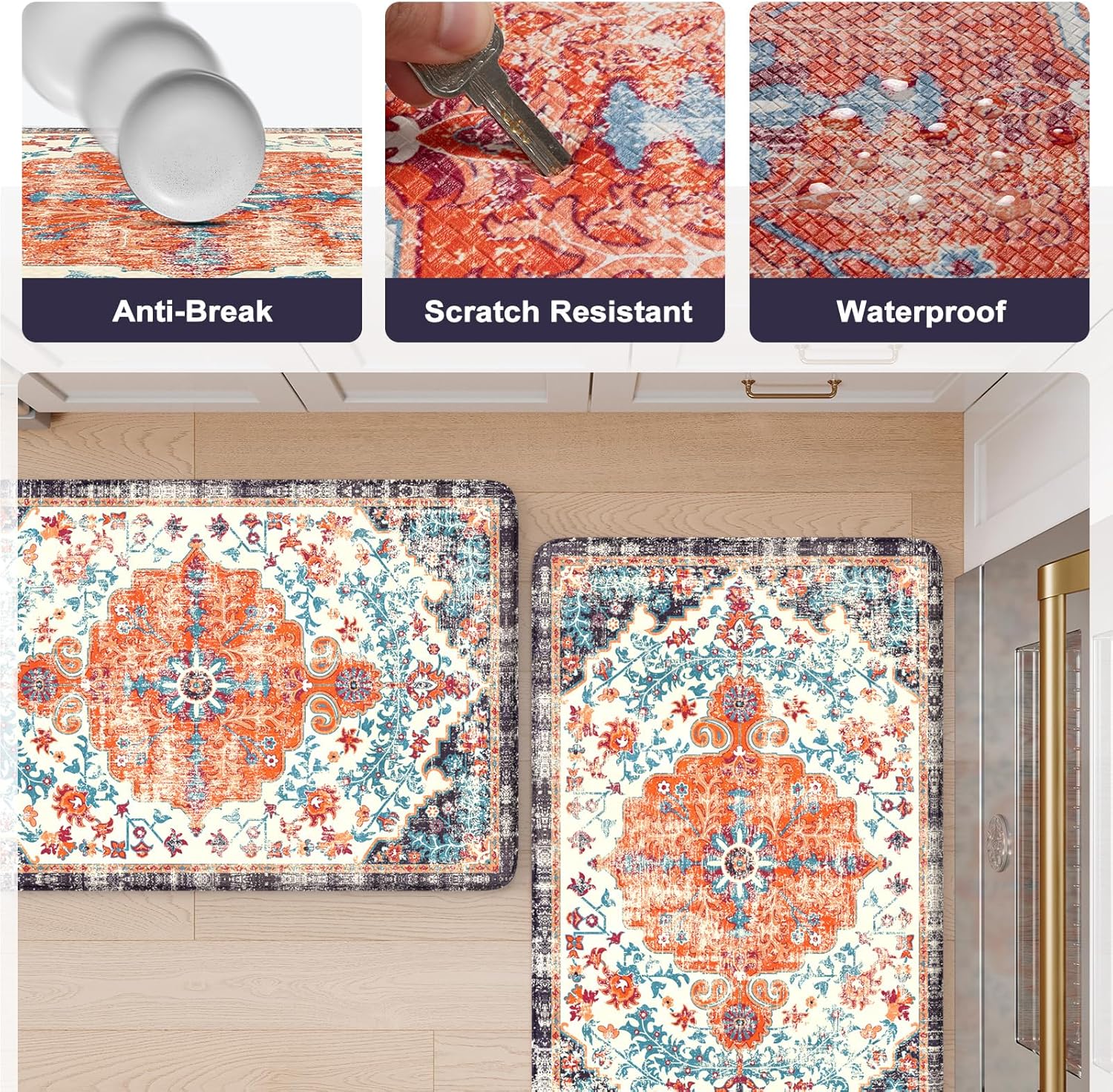 KIMODE Anti Fatigue Kitchen Mats, Boho Vintage Kitchen Rugs - Sets of 2, Cushioned Non Slip Comfort Rugs for Kitchen Floor, Sink, Laundry, Desk - Orange/Purple 20"x47"+20"x32"