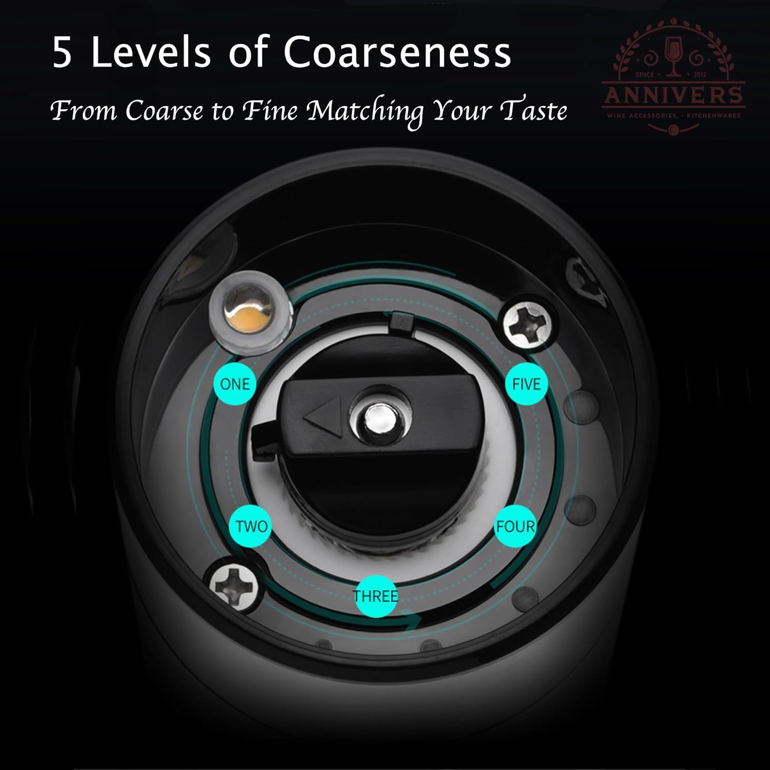 - ✅ 5 Levels of Grinding Coarseness — Choose the coarseness of grains according to your preference. Rotate the knob on the bottom from Coarse to Fine, to achieve the perfect coarseness for matching your dishes.