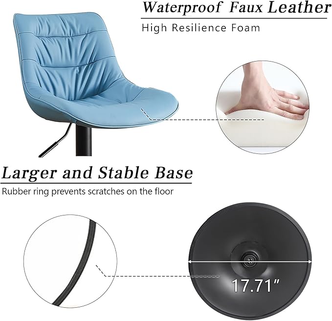 Kidol & Shellder Bar Stools Set of 2 Adjustable Swivel Blue, PU Leather Upholstered with Back, Modern Counter Height Stools for Kitchen Island, Home Bar