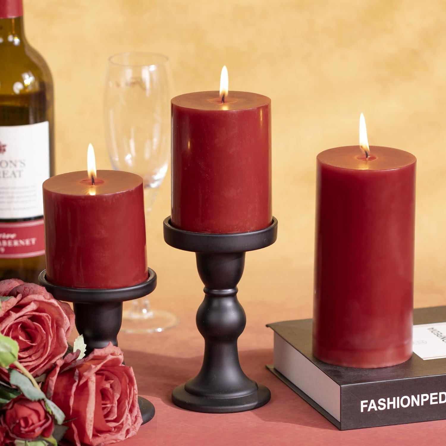 KONNI Dark Red Pillar Candles Set of 3, 3"x 4" Unscented Pillar Candles Bulk, 39 Hours Long Burning Candles, Smokeless&Dripless Large Round Candle for Wedding, Home Decoration, Parties, Spas, Dinner