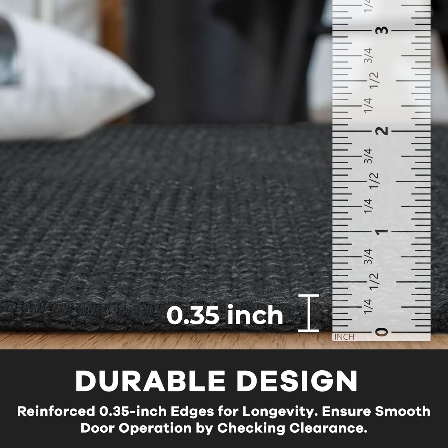 - Check Door Clearance: The 4' x 6' (48" x 72") rug is 0.2" thick, with reinforced edges up to 0.35". If your door gap is under 0.4", this rug may prevent it from opening smoothly. Measure your door clearance before purchase