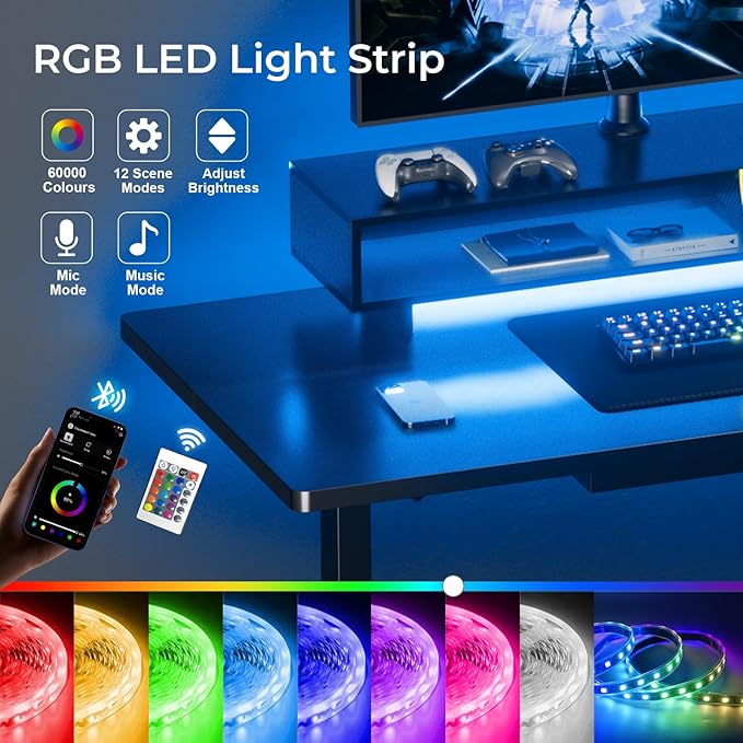 - Gaming Desk with Colorful LED Lights: This gaming desk features RGB LED lights with 12 scene modes and 5 adjustable brightness levels that can be switched cyclically. The adjustable standing desk also includes a built-in power strip with 2 AC outlets and 2 USB charging ports, making it convenient to charge your devices such as cell phones, tablets, and notebooks. This computer desk functionality for your gaming and work needs