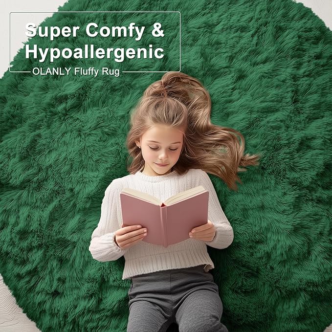 OLANLY Dark Green Round Rugs for Bedroom - Machine Washable, 3 ft Circle Area Rugs for Living Room, Soft and Fluffy Shaggy Carpet for Teen Girls and Boys, Nursery Rooms, Dorms, Home Decor Aesthetic
