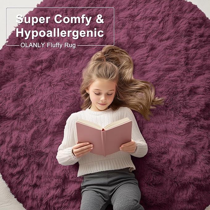 OLANLY Burgundy Round Rugs for Bedroom - Machine Washable, 9 ft Circle Area Rugs for Living Room, Soft and Fluffy Shaggy Carpet for Teen Girls and Boys, Nursery Rooms, Dorms, Home Decor Aesthetic
