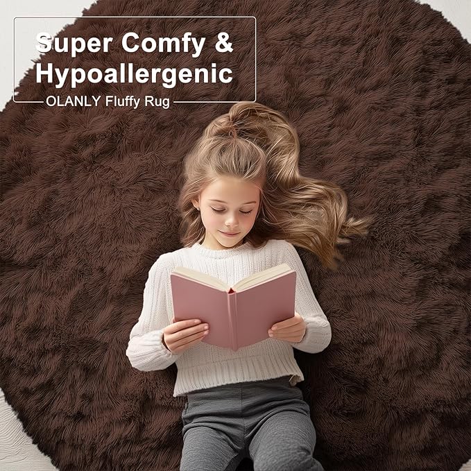 OLANLY Coffee Round Rugs for Bedroom - Machine Washable, 7 ft Circle Area Rugs for Living Room, Soft and Fluffy Shaggy Carpet for Teen Girls and Boys, Nursery Rooms, Dorms, Home Decor Aesthetic