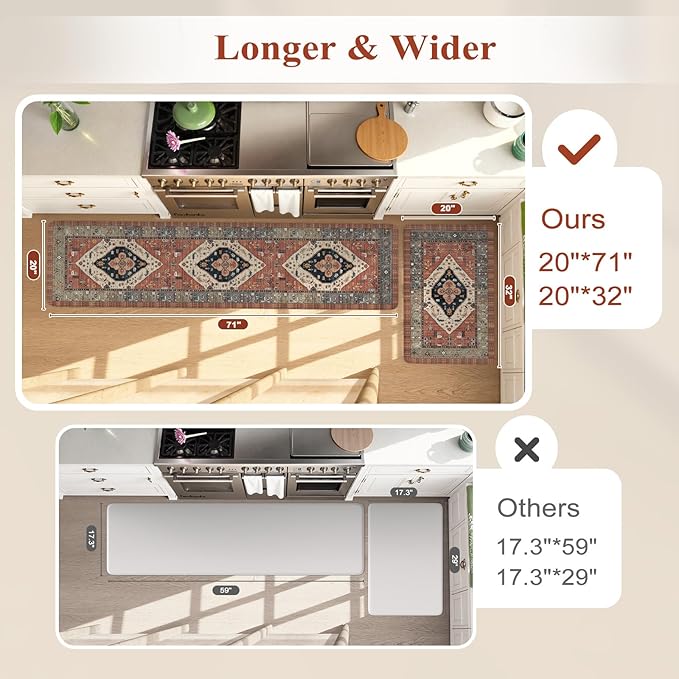 - Wider & Longer Kitchen Rugs 2PC:The set contains 2 rectangular kitchen mats measure 20"x71"+20"x32" which are wider than ordinary kitchen mats on the market.The mats are made of premium materials, which are friendly to your kids and pets