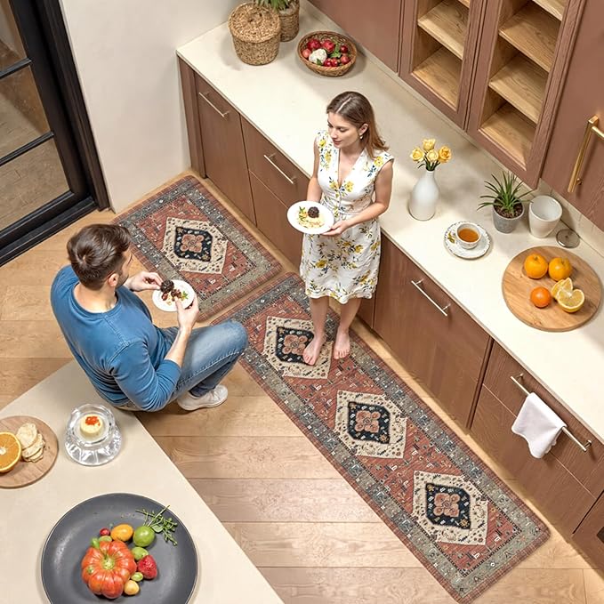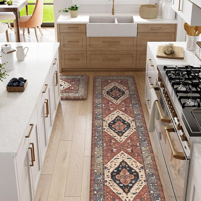 - Versatile:Boho style design features a central medallion and floral motifs in the style of rugs,easily to match your kitchen decor.Soft thick foam provides ample support for standing in kitchen sink,laundry room, office,bathroom,dinning room,or any other high-traffic area