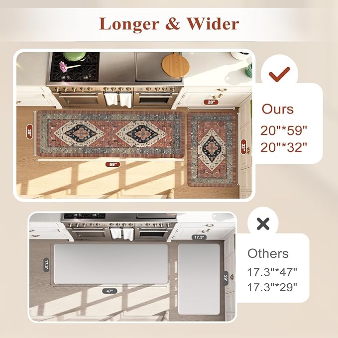 - Wider & Longer Kitchen Rugs 2PC:The set contains 2 rectangular kitchen mats measure 20"x59"+20"x32" which are wider than ordinary kitchen mats on the market.The mats are made of premium materials, which are friendly to your kids and pets