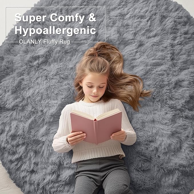 OLANLY Light Grey Round Rugs for Bedroom - Machine Washable, 9 ft Circle Area Rugs for Living Room, Soft and Fluffy Shaggy Carpet for Teen Girls and Boys, Nursery Rooms, Dorms, Home Decor Aesthetic