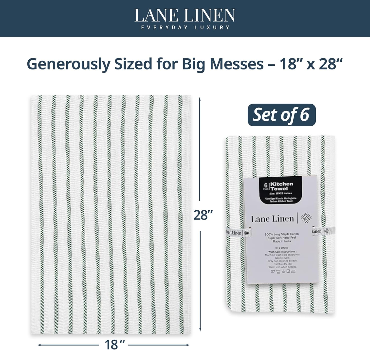 - Value Pack : Lane Linen kitchen towels and dishcloths sets includes 6 Pack Dish Towels For Drying Dishes. Great alternative to paper towels. With a convenient size of 18 x 28" anyone can handle these kitchen linen sets and you will never run out of dish towels again!