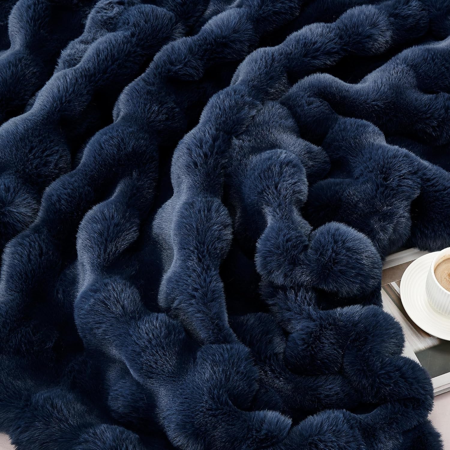 JONIYEAR Soft Fuzzy Bubble Faux Rabbit Fur Throw Blanket for Couch 50" x 60", Double Sided Textured Warm Fluffy Blanket for Winter,Luxury Cozy Puffy Shaggy Comfy Furry Blankets for Sofa Bed, Navy Blue