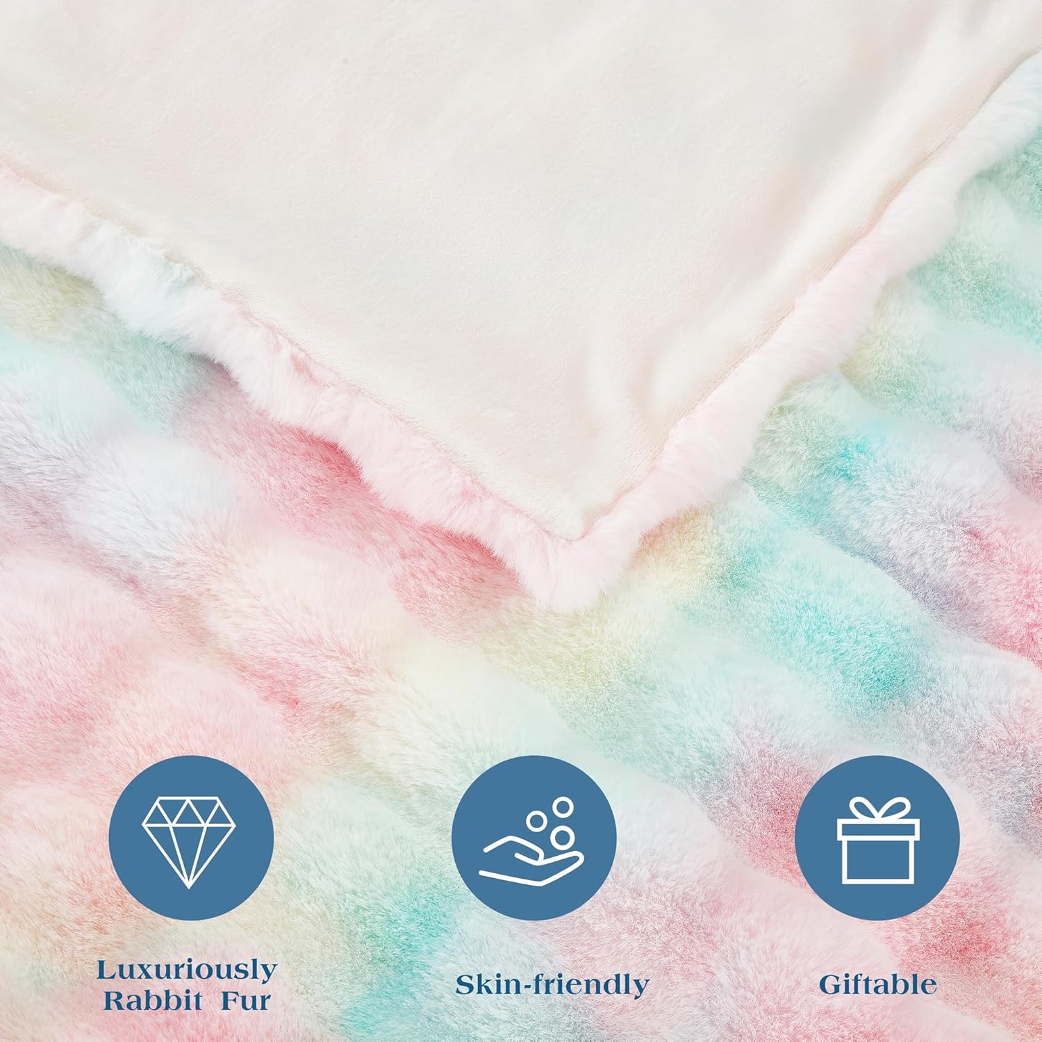 JONIYEAR Decorative Colorful Fluffy Bubble Faux Rabbit Fur Blanket Twin Size 60" x 70",Oversized Thick Warm Fuzzy Blanket for Winter,Luxe Pastel Cute Shaggy Cozy Furry Blankets for Women Girl, Rainbow