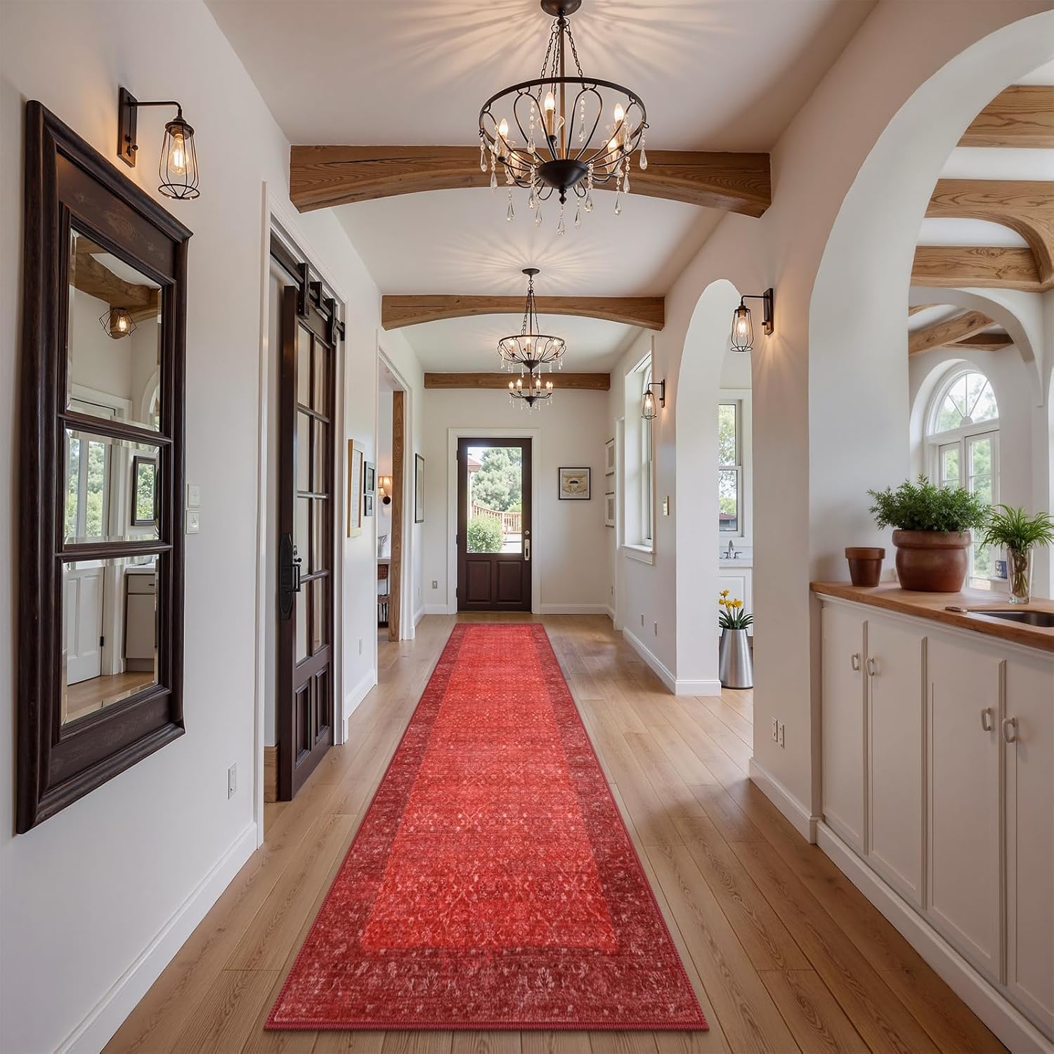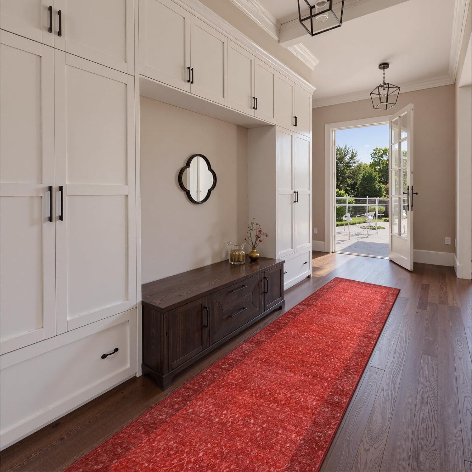 Vintage Red Runners for Hallways, 2.6x10 Washable Boho Kitchen Rug, Soft Low Pile Long Runner Rug for Hall Bedroom Bathroom, Ultra-Thin Floor Carpet for Entryway Indoor Party(2'6"x10', Red)