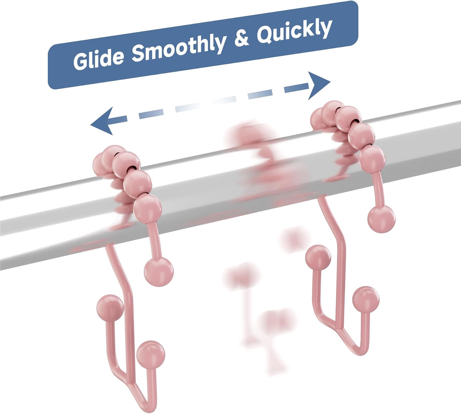 Titanker Shower Curtain Hooks Rings, Rust-Resistant Metal Double Glide Shower Hooks for Bathroom Shower Rods Curtains, Set of 12 Hooks - Light Pink