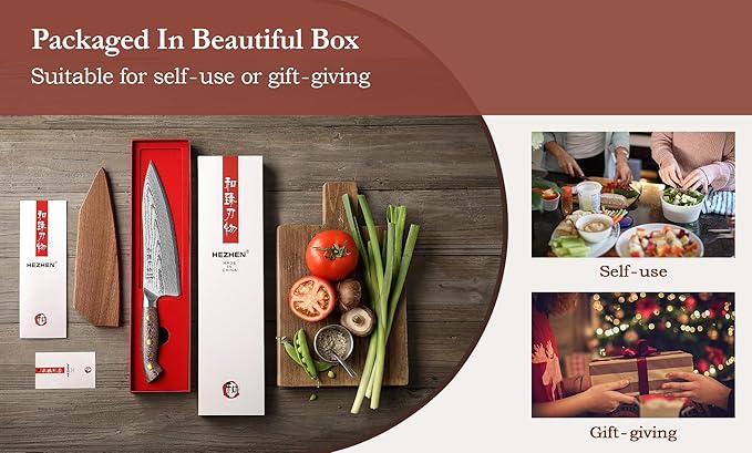 - [Includes Protective Sheath & Gift-Ready Packaging] Comes with a custom-fit blade sheath for storage and edge protection. Beautifully presented in an elegant gift box, this chef knife set makes a practical and sophisticated gift for weddings, holidays, birthdays, or culinary enthusiasts.