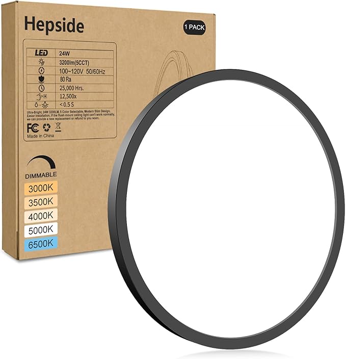 hepside LED Flush Mount Ceiling Light Fixture, 12Inch 24W, Dimmable&3000K/3500K/4000K/5000K/6500K Adjustable Low Profile Ceiling Lights, 3200LM Modern Lamp for Bedroom, Porch, Kitchen, Hallway, Black