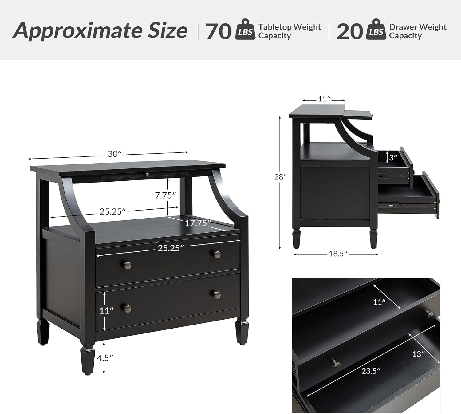 HULALA HOME Large Farmhouse Nightstand with Charging Station, Mid-Century Modern 2 Drawer Dresser, Bedside Table with Pull Out Shelf and Hidden Storage Space for Bedroom, Black