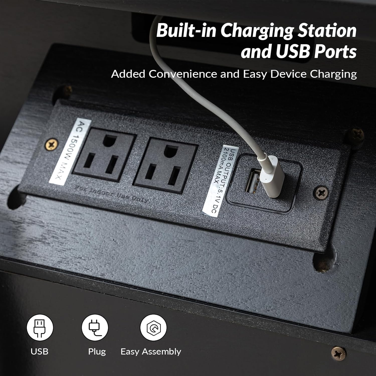 - ăBedside Table with Charging StationăThis two-drawer table has 2 AC sockets and 2 USB ports for easy charging. You can place a lamp without worrying about power issues, and the cable management keeps wires tidy.